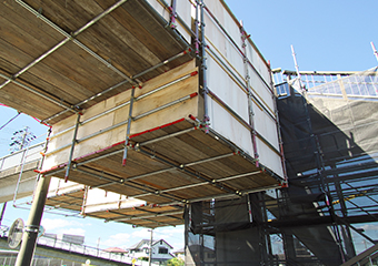 上から吊り下げる形で作業床を設ける足場です。ビル建築現場での鉄骨組立て工事や橋梁工事など、地面の上に通常の足場設置が不可能な場合の作業床として吊り足場をご提供いたします。